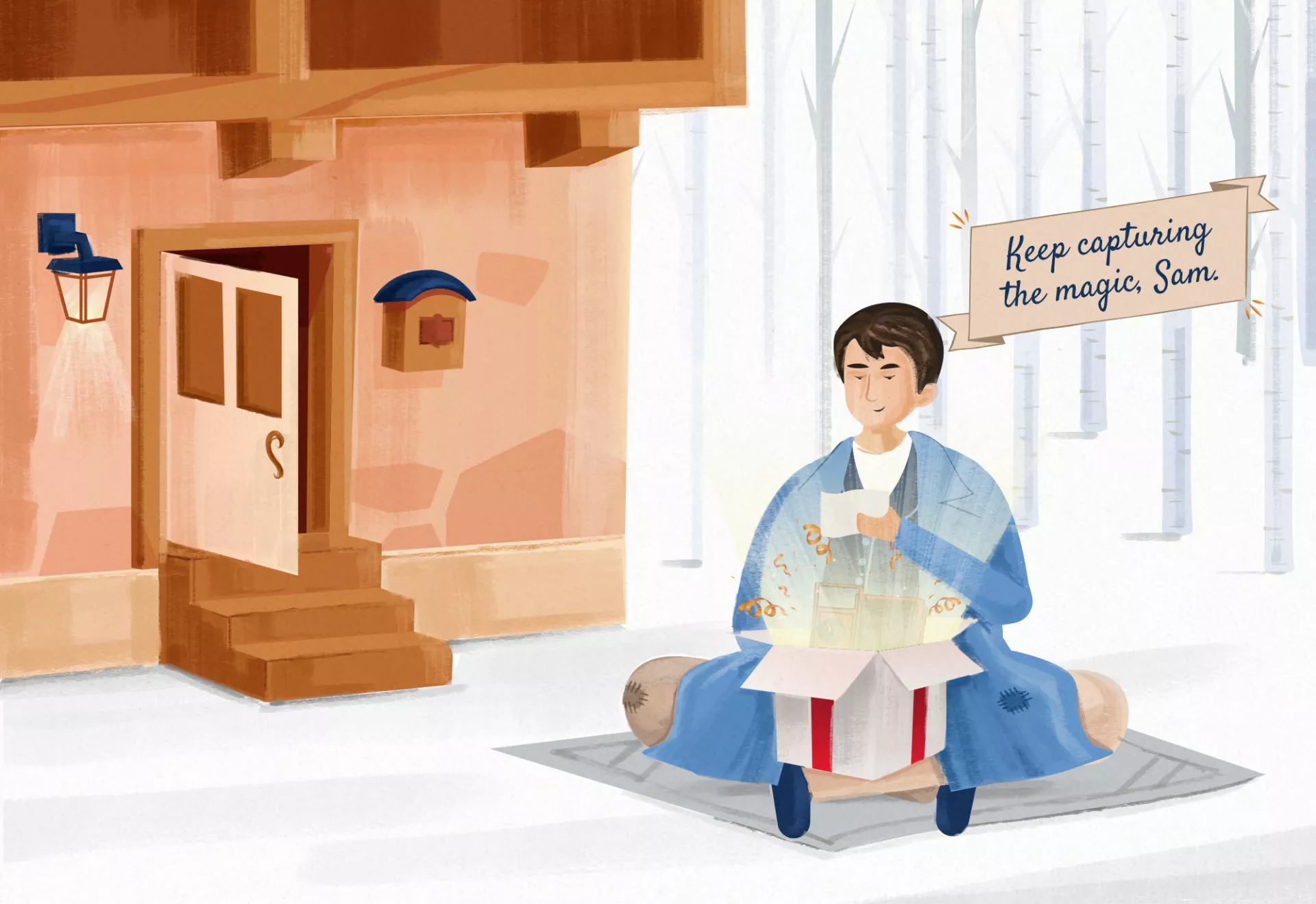 Just when Sam was starting to think a new camera and photography career would be an elusive dream, a mysterious Christmas gift showed up at his doorstep. Nestled inside the stunningly wrapped box was a brand new camera, a true work of craftsmanship.